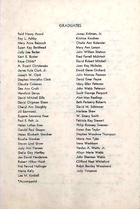 Note: We were not there, but it is quite probable that the five student speeches listed above in this 1936 program turned out to be the most boring, insipid orations ever delivered at any Brigham Young High School Graduation Exercise in history. We extend our belated sympathies to everyone involved in any way.